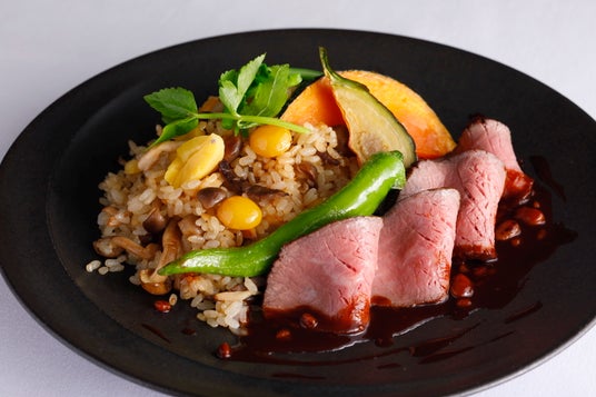 ビール酵母を原料としたこだわりの飼料、大自然で育った黒毛和牛のローストビーフと、恵み豊かな四万十川のほとりで農薬や化学肥料を使わず野菜の持つ力を引き出した『桐島畑』の野菜。薪や釜戸を使用する180年以上続く昔ながらの製法で時間をかけて手作りされた『井上糀店』のもろみ味噌をアクセントにピラフに仕上げました。