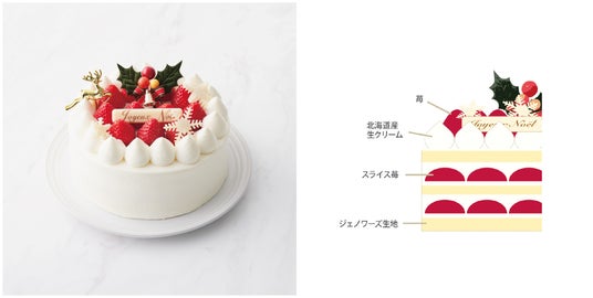 ジェノワーズ生地に北海道産生クリームとスライス苺をサンドし、仕上げに生クリームと苺をたっぷりとデコレーション。