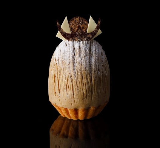 兵庫県産「銀寄」の和栗のペーストにイタリア産マロングラッセ入りアーモンドタルト、チョコレートをコーティングした黒糖メレンゲを乗せました。