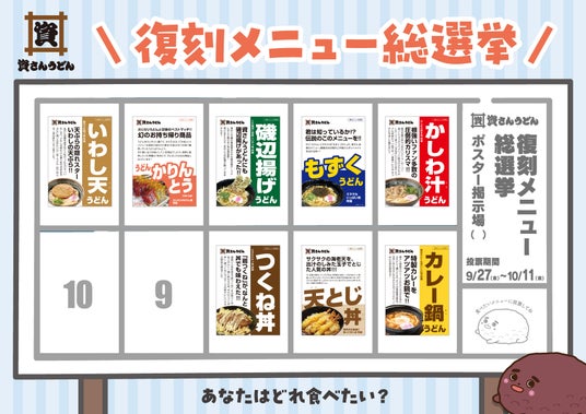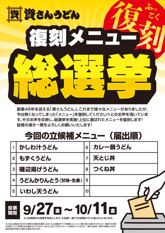 9/27(金)15時~資さんうどん復刻メニュー総選挙を開催