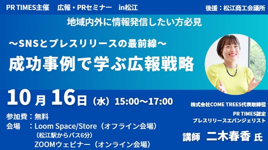 「地方の発信力を底上げする!」をミッションに、企業の情報発信をサポートする株式会社COME TREES(島根県松江市)の代表取締役 二木 春香は、2025年10月16日(水)にSNSとプレスリリースをテーマにしたセミナーに登壇いたします。