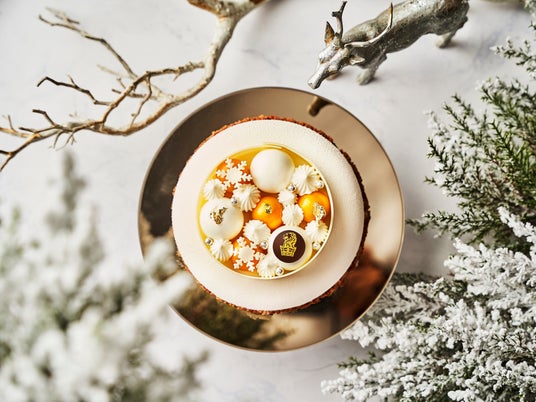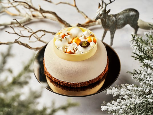 なめらかなココナッツムースの中に、マンゴーパッションジュレ、そしてパン・デピス(フランス伝統のクリスマス菓子)に用いる、シナモン・クローヴ・カルダモン等がほのかに香るクリームを忍ばせました。クリスマスツリーを華やかに彩るオーナメントボールやスノーフレークをちりばめた真っ白なケーキが、フェスティブシーズンのテーブルを華やかに彩ります。