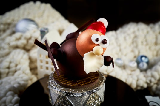 ダークチョコレートの上に、スキーで風を切るサンタクロースをあしらいました。ショコラティエが1点1点手作りで仕上げた、表情やディテールにご注目ください。