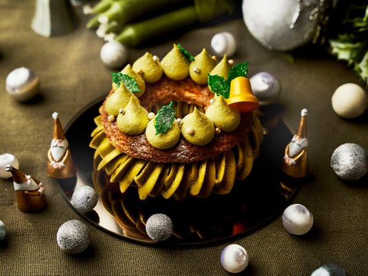 フランス伝統菓子パリ・ブレストでクリスマスリースを表現しました。 ふんわりと焼き上げたシューで、ピスタチオの風味が生きたピスタチオクリーム、カシスジュレをサンド。キャラメライズしたピスタチオがアクセントに。