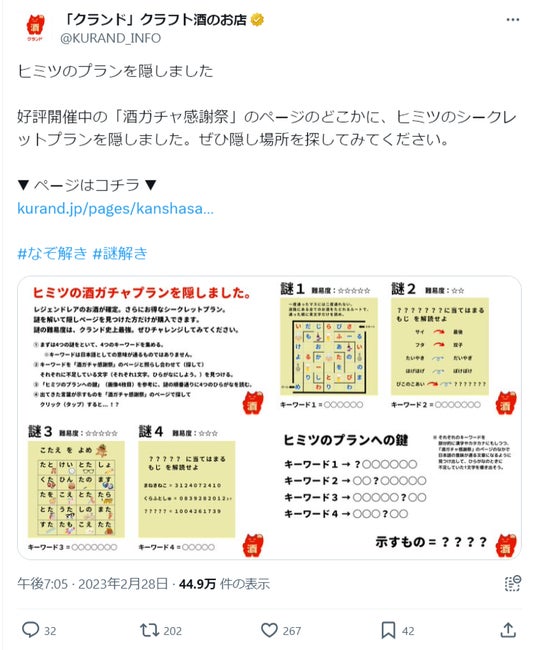 SNS上での期間限定開催のみだったため、「気付いた時には終わっていた」「SNSを見ないので知らなかった」などといった声も多く寄せられていたことから、より多くの方にクランドの謎解きプランをお楽しみいただくため、謎を解かないとお酒が買えない「謎の酒屋」の特設ページを開店しました。