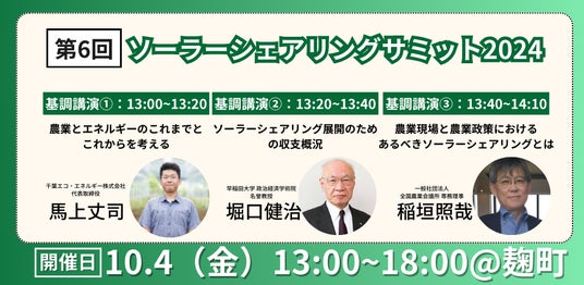 2013年より営農型太陽光発電(ソーラーシェアリング)に取り組み、国内外で450件以上のコンサルティング実績を持つ千葉エコ・エネルギー株式会社(本社:千葉県千葉市、代表取締役:馬上丈司)と神奈川県内で6つのソーラーシェアリング設備を保有し、再生可能エネルギーの普及促進に取り組む合同会社小田原かなごてファーム(本社:神奈川県小田原市、代表社員:小山田大和)が10月4日(金)に開催する「ソーラーシェアリングサミット2024」にて、当社代表馬上をはじめとする基調講演者の講演テーマが決定しました。