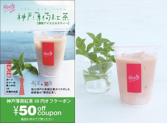 神戸ポートタワー低層1階外側北にある「Ready go round mini[レディーゴー ラウンド ミニ]」のオリジナルの新テイクアウトメニューです。神戸の老舗「鈴木薄荷」と「神戸紅茶」がコラボしてできあがった神戸ポートタワーでしか味わえないスペシャルな「神戸薄荷紅茶」(アイスミルクティー)です。クーポン券を使えば特別価格で購入できます。