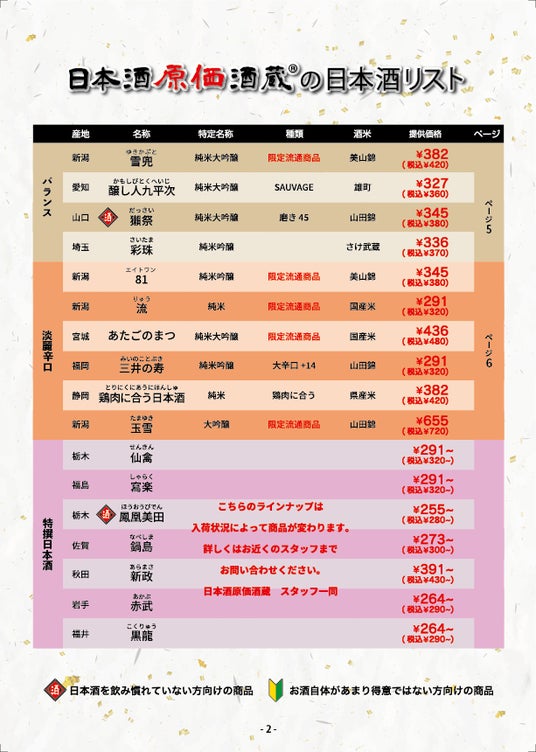 50種超の日本酒を原価で提供しており、獺祭、冩楽、鳳凰美田、鍋島、黒龍など、商品のほぼ全てが特定名称酒と呼ばれるクオリティの高い日本酒です。