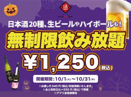 日本酒原価酒蔵(http://sake-genkabar.com) にて時間無制限飲み放題を10/1(火)~10/31(木)まで期間限定で実施致します。当キャンペーンでは生ビールやハイボール、サワー類はもちろん、特定名称酒をメインとした日本酒20種も含まれた大変お得なキャンペーンとなっております。