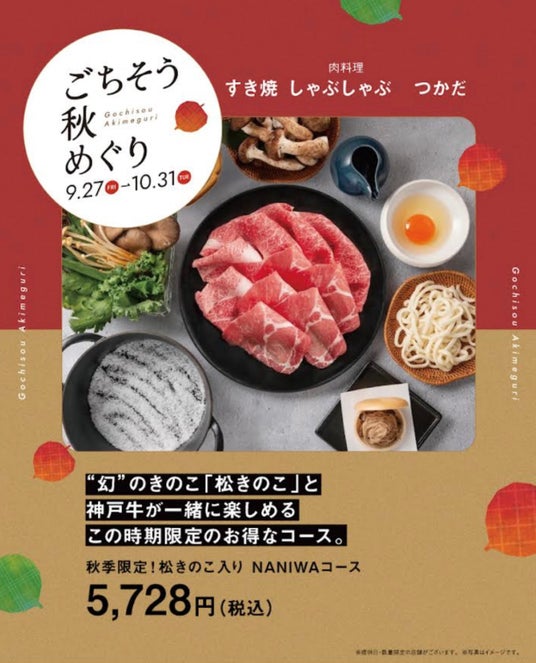 株式会社エー・ピーホールディングス(本社:東京都豊島区、代表取締役会長 兼 社長:米山久)が運営する、「すき焼 しゃぶしゃぶつかだ KITTE大阪店」では、すき焼のコースメニューに、松茸のような見た目と食感の珍しい「松きのこ」を使った秋限定のメニューを開始しました。