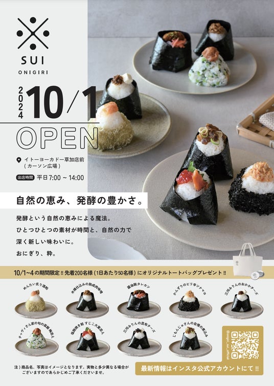 株式会社Roots(本社:埼玉県草加市、代表取締役:國分隆)は、埼玉県草加市にて、発酵をコンセプトにしたおにぎり専門フードトラック店舗「ONIGIRI SUI」を、2024年10月1日(火)にオープンいたします。