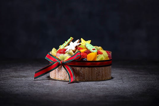 国産いちご、フランボワーズ、マンゴー、ブルーベリー、キウィなどのフレッシュフルーツが贅沢に乗った、見た目にも鮮やかなケーキです。ベースはマダガスカル産のバニラビーンズを使ったなめらかなババロアと香ばしいビスキュイ。フレッシュなフルーツの美味しさが際立つよう、あえてシンプルに仕上げました。聖なる夜に、キリっと冷えたシャンパンと一緒に味わうのもおすすめです。