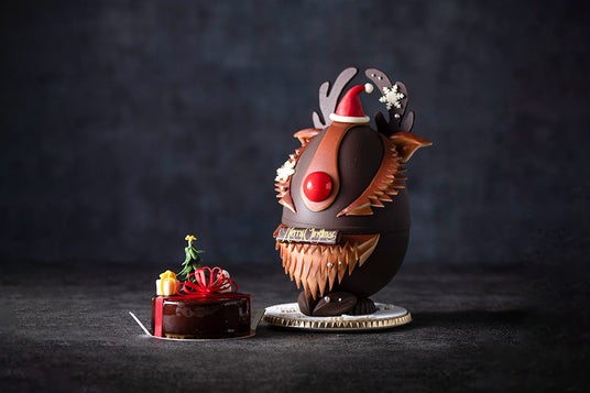 チョコレート製ボックスの蓋を開けると、中からなめらかなチョコレートのムースケーキが現われます。上質なクーベルチュールチョコレート※1を使用した濃厚なムースの中に、爽やかなライムのパルフェ※2やフランボワーズを閉じ込めました。ケーキの下にはサンタクロースからのプレゼントも・・・。それは蓋を開けてのお楽しみ。星空を駆けるトナカイがモチーフの、遊び心と夢のあるユニークなケーキです。