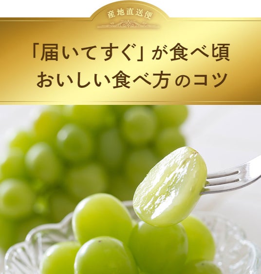 ・「届いてすぐ」が食べ頃 おいしい食べ方のコツ 少し冷やしてから召し上がるのが特にオススメです。食べる2~3時間前に冷蔵庫で冷やすことでシャインマスカット特有の甘みとみずみずしさがひき立ちます。