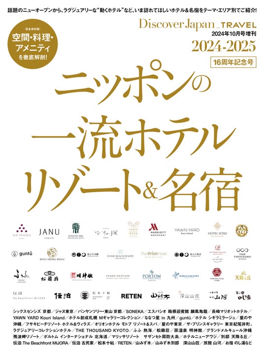株式会社ディスカバー・ジャパン(所在地:東京都港区、代表取締役社長:高橋俊宏)が発行する月刊誌『Discover Japan(ディスカバー・ジャパン)』2024年10月号増刊「ニッポンの一流ホテル・リゾート&名宿 2024-2025」が発売されました。