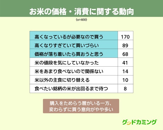 - 高くなっても米を買う意向の消費者が多数派だが、買い控えも目立つ結果に
