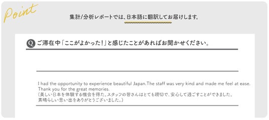 外国語対応のお客様アンケートを導入することで、実際に宿泊された外国のお客様が「何にどう戸惑われたのか」を知り、また「何に感動されたのか」を知ることもできるようになります。
