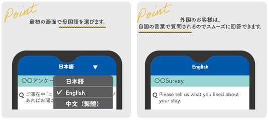 インバウンド顧客満足度向上の呼び水に外国人観光客様が、何に満足され、何に戸惑われたのかは、意外と「実際に聞いてみないとわからない」ものです。多言語対応オプションが生の声を集めるための一助となり、インバウンドの顧客満足度向上の呼び水になればと思っております。