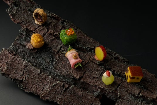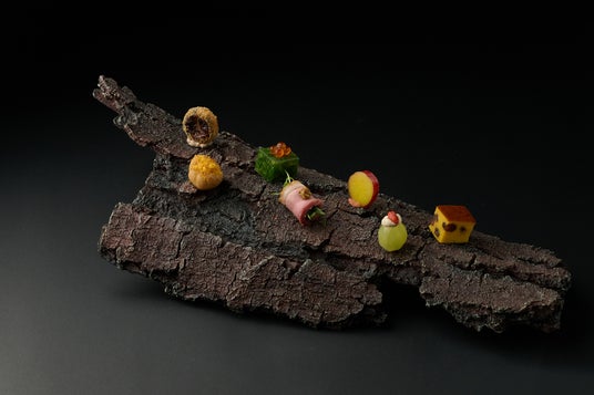星のやグーグァンや谷關地域に多く生育する松の木の皮を模した器に、山の幸を使った7品を盛り付けました。谷關には「谷關七雄(チーション)」と呼ばれる7座の高い山があり、その山々の秋や冬の味覚をイメージした料理が並びます。