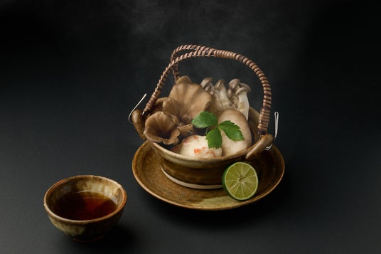 谷關近隣は、高い山が多く深い霧立ち込めるため、キノコがよく育ち名産となっています。台湾の「燉(ドゥン)」というとろ火で長い時間をかける調理法で、キノコと鶏ガラから取った山のコンソメと、日本の昆布と鰹節で取った一番だしを合わせました。標高の高い谷關地域の深い霧の中で育ったあわび茸や山エノキは、その独特な食感が特徴です。また、ふわふわともっちり、2つの異なる食感が合わさった車海老真薯を楽しめます。