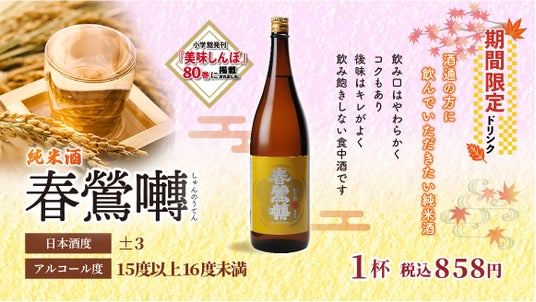 この秋、活美登利では、230余年の歴史を誇る老舗酒蔵が生んだ日本酒「春鶯囀(しゅんのうてん)」を期間限定でお楽しみいただけます。