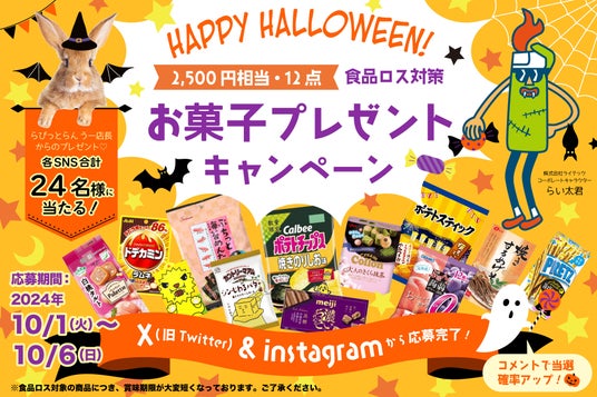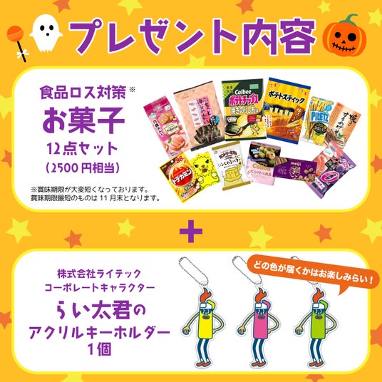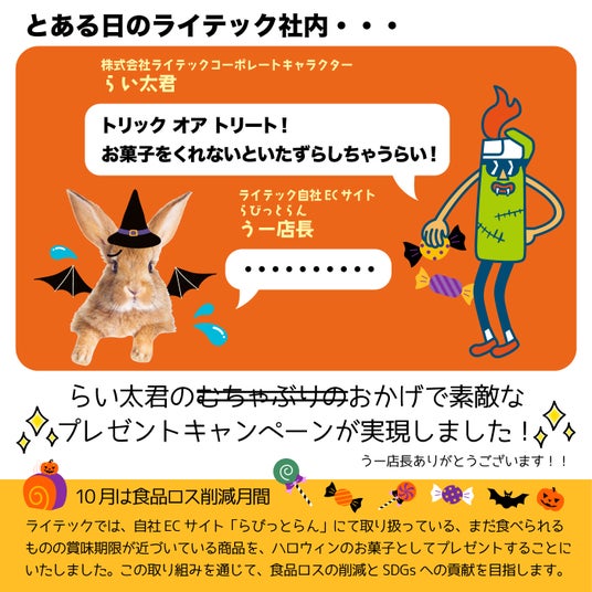 ライテックでは、自社ECサイト「らびっとらん」にて取り扱っている、まだ食べられるものの賞味期限が近づいている商品を、ハロウィンのお菓子としてプレゼントすることにいたしました。この取り組みを通じて、食品ロスの削減とSDGsへの貢献を目指します。