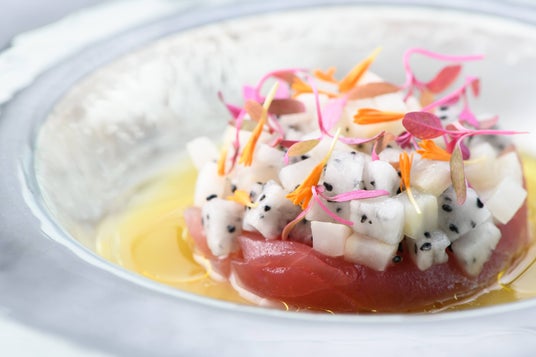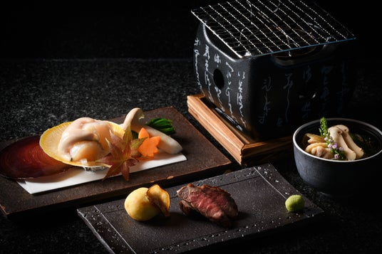 鹿児島の食の魅力を地元の名酒と堪能できる居酒屋「さつまぐま」では、なめらかな口当たりで、甘く濃厚な味わいや旨みが特徴の“月日貝”を七輪焼きにて提供する『日置産 月日貝の七輪焼き』や、鹿児島県民には秋の風物詩として「秋太郎」の愛称で親しまれているバショウカジキのお造りなど、旬の日置食材をシェフのおまかせコースやアラカルトにて提供します。