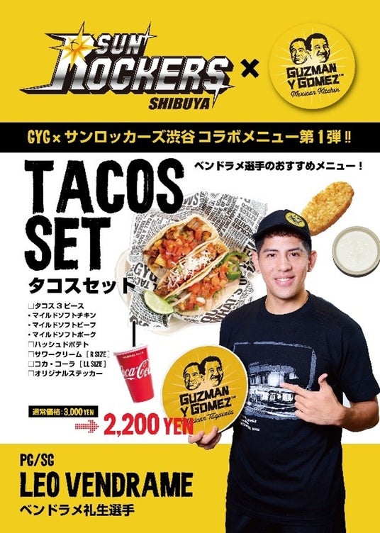 サンロッカーズ渋谷のホームゲーム開催日にGYG青山店にて、サンロッカーズ渋谷の観戦チケットの半券もしくはチケット表示画面をご提示いただくと、Guzman y Gomezの商品が200円オフになるキャンペーンを行います。