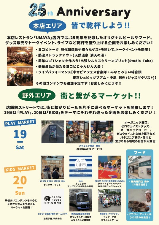 横浜ビール本店レストランUMAYAにて、25周年イベント「YOKOHAMA BEER 25th ANNIVERSARY FESTIVAL -PARK-」 を2024/10/19(土)、20(日)開催!『YOKOHAMA FEST HELLES』もお楽しみ頂けますのでこの機会にぜひ!https://prtimes.jp/main/html/rd/p/000000033.000071203.html