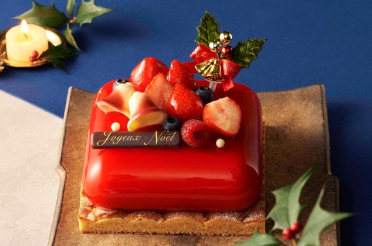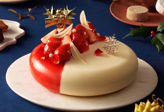 きらめくクリスマスの夜をイメージして仕上げた真っ赤なケーキ。ホワイトチョコレートムースで甘酸っぱいフランボワーズムース、フランボ ワーズソースを包み、バターとシトロンが香るアーモンド生地にのせました。クリスマスの夜に華やぎを添えて。
