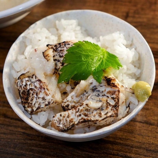 真鯛フィレの炙り焼き茶漬け飯真鯛の切り身をオーブンで焼いてから切り分けて、さらに特性白しょうゆをスプレーしてバーナーで焼き目を入れました。