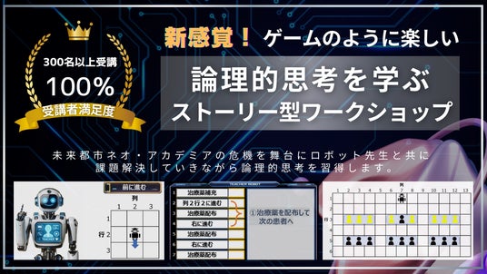 本ワークショップでは、参加者は未来都市「ネオ・アカデミア」で発生する危機的な状況を舞台に、ロボットの動きを操作し、問題を解決しながら論理的思考を学ぶストーリー形式のトレーニングを体験します。条件分岐や繰り返し処理、アルゴリズムといった基本概念を段階的に習得していくため、初心者も無理なく楽しみながら身につけることができます。