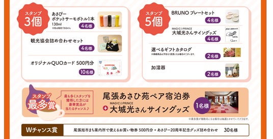 豪華景品には有名ブランドの食器や家電製品、また抽選に外れてしまった方でも当選チャンスがあるWチャンス賞など盛りだくさんです。前回に引き続き、東海地方で活躍中のボーイズグループ『MAG!C☆PRINCE』のメンバー「大城光」さんに「旭色」プロジェクトにも参加いただき、サイングッズを豪華景品として用意しています。対象のスポットやスタンプラリーの参加方法は「旭色」ホームページや市内掲載チラシ、リーフレット(参加店舗・市内公共施設等で配布)でご確認いただけます。