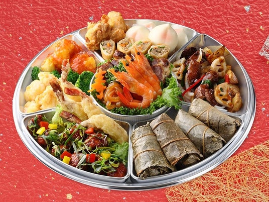 牛フィレと蓮根のオイスターソース炒め/祝い桃饅頭/鶏の唐揚げ/春巻/有頭海老の湯引き/自家製チャーシュー/くらげのマスタードソース和え/蓮の葉包みごはん/肉団子・九条ねぎ・パプリカの甘酢あんかけ/ロブスターのチリソース煮込みとフルーツマヨネーズソース和え/ずわい蟹の中華天ぷら 甘辛甘酢あんかけ