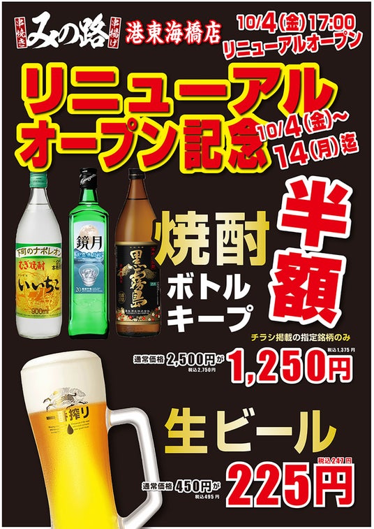 リニューアルオープン記念で10月14日(月)までは『生ビール半額』と『焼酎ボトルキープ半額』イベント開催致します。