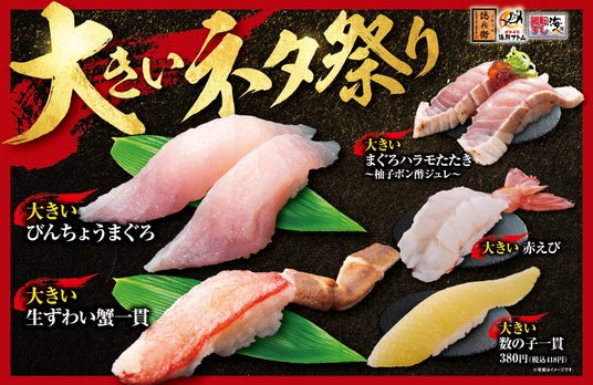 『大きいネタ祭り』では、「大きいびんちょうまぐろ」「大きい生ずわい蟹一貫」「大きいまぐろハラモたたき~柚子ポン酢ジュレ~」「大きい赤えび」「大きい数の子」の人気の5品を食べ応えのある大きさにこだわってご用意しています。
