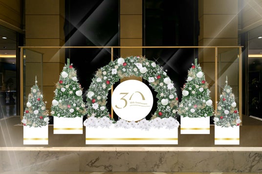 今年のクリスマスデコレーションは、「White&クラシックビンテージ」をテーマといたしました。来年開業30周年を迎えるにあたり、今までたくさんのゲストと共に歩んできた数多くの物語に思いを馳せ、時を超えた素敵な物語が訪れたゲストの心に蘇るようにとの思いを込め、クラシックビンテージとホテル外観の白を織り交ぜたクリスマスディスプレイです。