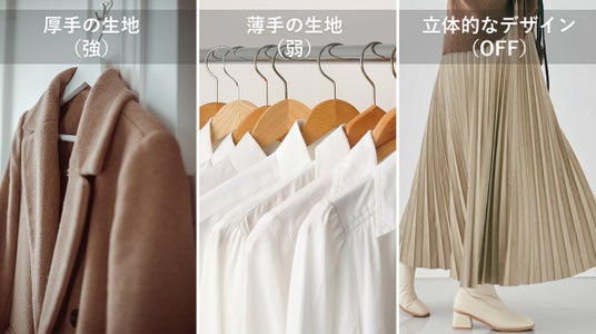 デニム・コートなどの厚手の生地は「強」、綿・麻などの一般的な薄手の生地は「弱」、フリル、プリーツが入った部分は「OFF」といった具合に、素材に合わせて調節することができます。