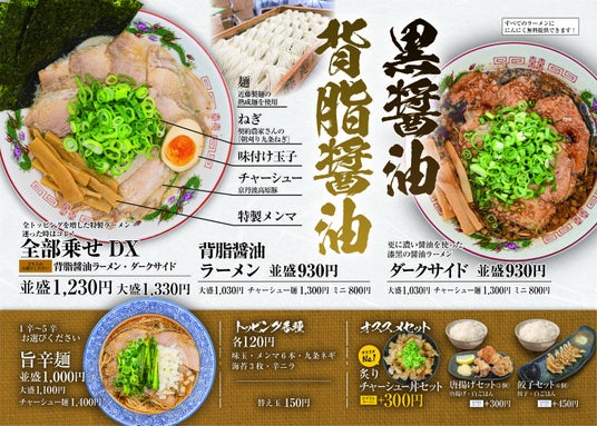 メイン商品は、京都ラーメンの代表格「背脂醤油ラーメン」。草津店限定メニューとして、生卵を添えた「ダークサイドSP(スペシャル)」登場