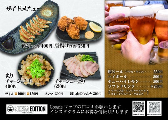 株式会社EDITION京都(本社:京都市東山区、代表取締役:渡邊賢太)は、この度京都の老舗製麺所「近藤製麺」の麺や醤油を使用した京都背脂醤油ラーメン店『麺屋EDITION』3号店「草津店」を、2024年10月11日(金) より滋賀県草津に新オープンします。当店が滋賀県に出店するのは、今回が初となります。
