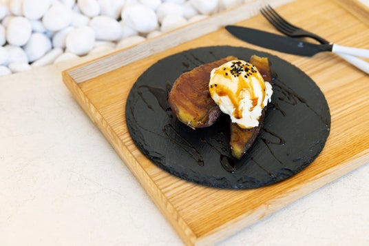 ねっとりとした食感と高い糖度が特徴の「紅はるか」を、注文を受けてから表面をこんがり炙ってパリパリに仕上げ、バニラアイスを乗せて提供します。仕上げのソースにはカラメルをはじめ、山本山の抹茶とほうじ茶から作った自家製の抹茶ソース、ほうじ茶ソースよりお好きなソースをお選びいただけます。