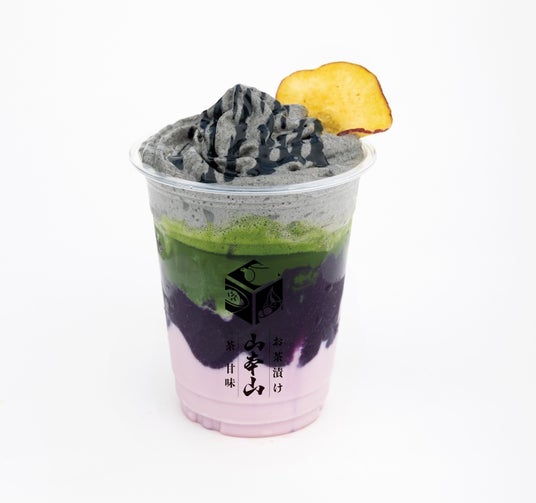 注文を受けてから一杯ずつ抹茶を点てて作る濃厚な「抹茶ラテ」の秋バージョンは「紫いも」で楽しみます。紫いもペーストをベースに手点て抹茶を注ぎ、アクセントに黒ごまクリームを絞りました。抹茶の旨みと紫いものなめらかな甘さ、香ばしいごまの風味が絶妙なバランスの一品です。