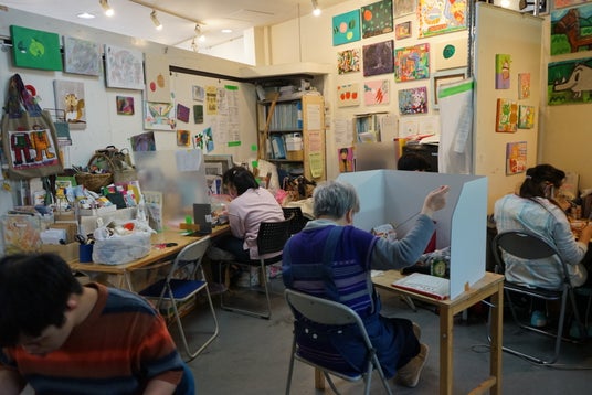 障がいのある人たちが街で働き、街で暮らす。なんの違和感もなく。それが街・社会のあり方だと考え、絵画、手織り、刺繍、フェルトなどの創作を中心に、ひとりひとりが自分の好きなものや世界観を表現する機会と場所の提供や、ギャラリーの企画・運営を行っています。付設ギャラリーでの年2回の企画展や、外部の障がい者アートを紹介する展覧会、公募展などで積極的に作品を発表しています。また出来上がった絵や刺繍、織りを加工し、バッグやポーチ、ピアス、ブローチなど様々な製品づくりをして販売しています。曜日ごとに決まった特定のプログラムをみんなで行うといったことは基本的に無く、その日に取り組みたい事を選択し、それぞれ自分のペースで創作活動を行っています。