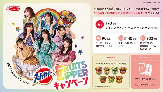 本キャンペーンは、7人組アイドルグループ「FRUITS ZIPPER」とのコラボレーション企画で、対象商品をご購入・ご応募いただいた方の中から、抽選で500名様にFRUITS ZIPPERオリジナルグッズが当たるキャンペーンとなっています。当キャンペーンには購入店舗に関わらずご応募いただけますが、さらに下記Wチャンス対象企業で購入したレシートでご応募いただいた方限定で、合計1,200名様にFRUITS ZIPPERオリジナルエコバッグが当たるチャンスもございます。詳細は下記企画概要をご参照ください。