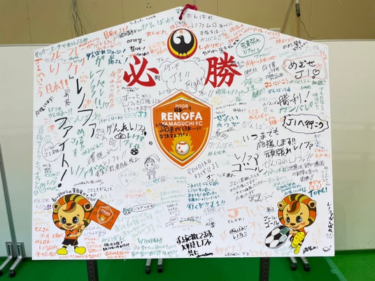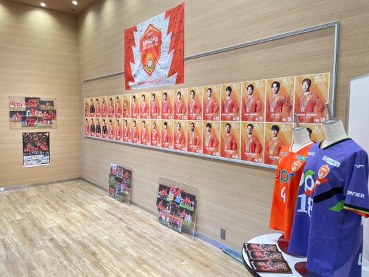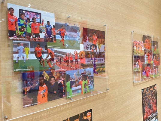 その他にも、レノファ選手たちへの応援メッセージが書かれた横断幕や、選手たちの活躍シーンのスナップ写真、ユニフォームなども飾り、応援ムードを盛り上げています。