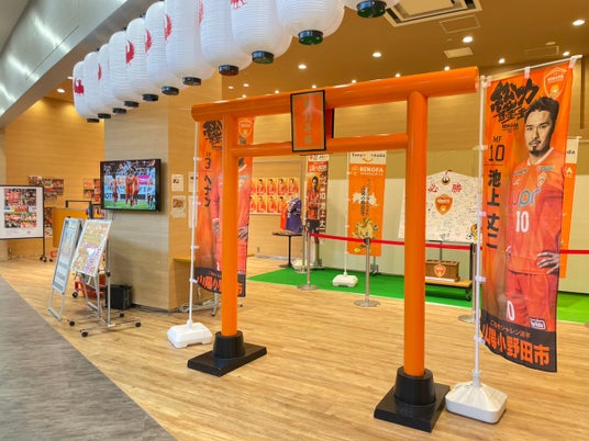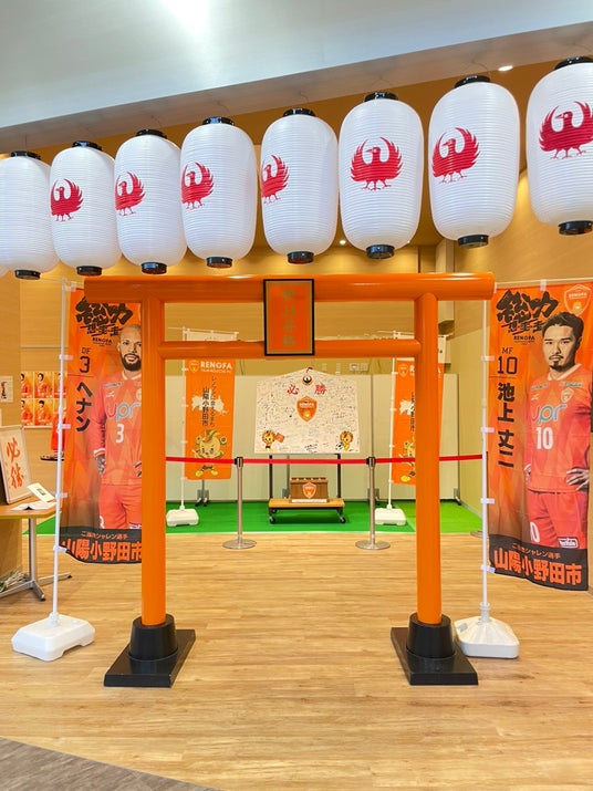 神社コーナーには、高さ約2.2mのレノファカラーの大鳥居を設置。その奥には"ご神体"として大きな絵馬(1.25m×1.1m)が祀られております。