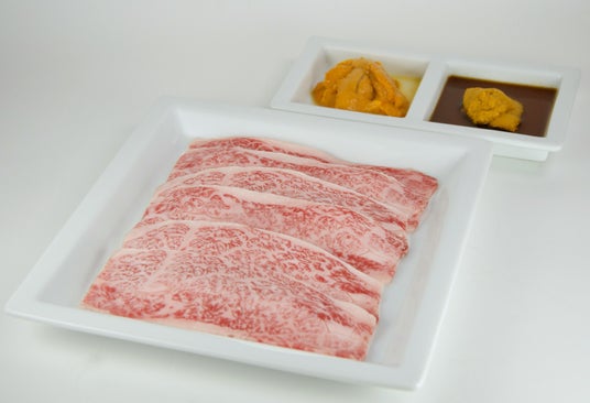 和牛うす切カルビ 雲丹のせ 2,680円(税込 2,948円)霜降りのうす切りカルビを「粒ウニ」と「オリジナルのウニソース」でお召し上がりください。「雲丹」と「肉」を掛け合わせた「ウニク」の贅沢な味わいをお楽しみいただけます。肉の脂の甘みと、ウニの海の香りを存分にご堪能ください。