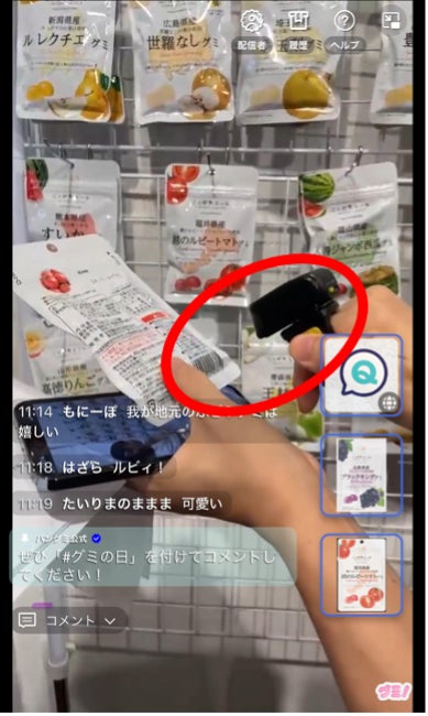 手元のバーコードリーダーを商品にかざすだけで、画面に商品を表示し、タップして購入することができるようになります。今回は、壁一面に展示したグミの中から、視聴者のコメントを踏まえて、出演者の気になるグミをその場で選んで紹介しました。売りたい商品を紹介するのではなく、店舗での接客のように視聴者によりそった接客が可能となります。
