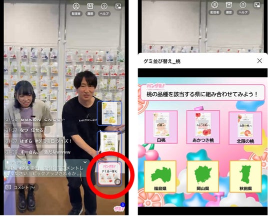 画面をタップして参加できるクイズなども配信中に出すことができます。コメントやアンケートとは異なり、タップだけで直感的に楽しく視聴内容の理解度を上げることができます。今回は桃の品種と県名を組み合わせるクイズを出題しました。
