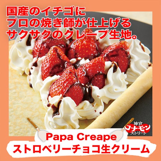 濃厚、こってりコナモン飯のあとは、もちろんデザート!パリッと食感のクレープ生地で愛される【Papa Creape】。国産のイチゴにプロの焼き師が仕上げるサクサクのクレープ生地、中にはたっぷり生クリームとチョコを入れ込んだ王道の「ストロベリーチョコ生クリーム」をお楽しみください。さらに、帰宅途中のちょい飲み、ランチタイムにもう一品、にもお応えするサイドメニューも充実。「鳥皮焼き」や「ホルモン焼き」、「ヤンニョムチキン」「鶏軟骨肉付き唐揚げ」などなど、おつまみにぴったりな充実のおかずメニューや、コナモンに相性ぴったりの”シュワシュワ"泡ドリンク各種もご用意しております。